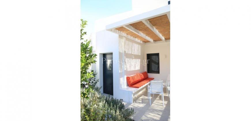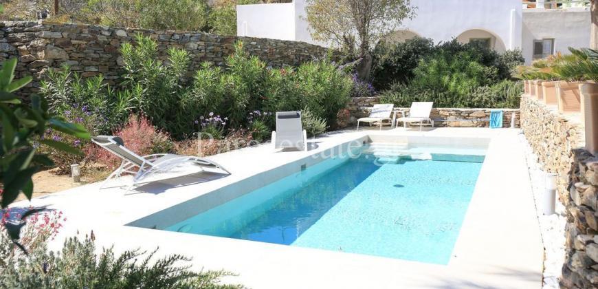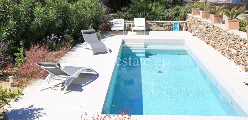 The house features wooden energy-efficient window frames with mosquito screens, A/C, cement mortar flooring & tiled bathrooms, storage room 6,16m², landscaped garden, swimming pool 30,40m² and is sold furnished and equipped.