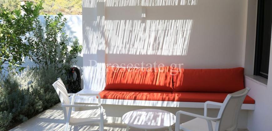 Today, it is a beautiful maisonette with 3 bedrooms that lead to small verandas with sea view, and 2 bathrooms on the first floor, as well an open plan living room with kitchen & dining area, WC and office leading to the yard with its wonderful garden and swimming pool.