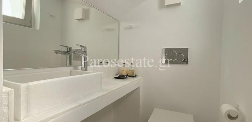 Στο ισόγειο 38,99μ² ενιαίος χώρος σαλόνι-κουζίνα-τραπεζαρία και WC επισκεπτών. Το επίπεδο αυτό βγαίνει σε μία μεγάλη αυλή με την ιδιωτική πισίνα υπερχείλισης 15μ². Στον όροφο 56,57μ² 3 υπνοδωμάτια και 1 λουτρό.
