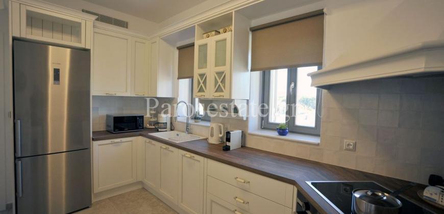 Through the double wooden door we enter the sunny living room with the large balcony doors allowing the eye to gaze at the endless blue, next the dining area and the kitchen equipped with electrical appliances and a pantry.